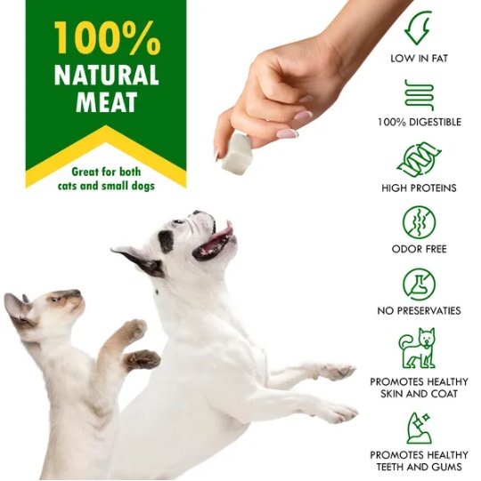 Perfect for training, rewarding, or adding a protein boost to meals, each bite is rich in taste and free from grains, fillers, or artificial additives. Soft, easy to chew, and packed with nutrition — it’s a treat that supports your pet’s muscle strength, energy, and overall wellbeing.